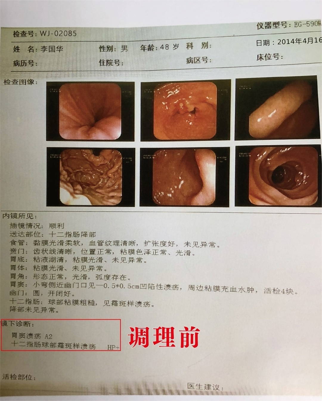 一天家里有个亲戚得胃癌去世了,刚开始也是一直不舒服,没太重视,再检查就是胃癌中期。我看到亲戚这样也十分担心自己的病, 跑到三甲医院去做了个胃镜,结果是糜烂性胃炎,胃窦溃疡A2和十二指肠球部霜斑样溃疡HP+,当时看到这样的结果既担心又恐慌,心想怎么就溃疡了,怎么会这么严重 ,不就是胃痛不舒服吗!?