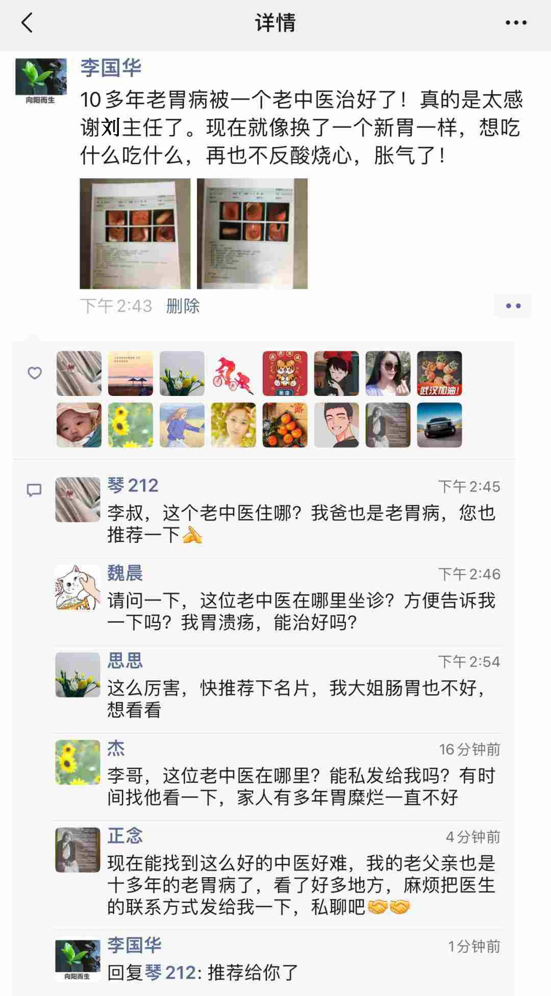 来自北京的李国华,前阵子发了条朋友圈说:“10多年老胃病被一个老中医治好了!真的是太感谢刘主任了。现在就像换了一个新胃一样,想吃什么吃什么,再也不反酸烧心,胀气了! ” 朋友圈一发,顿时就炸开了锅,身边的亲朋好友一个劲儿的询问这位老中医的联系方式。